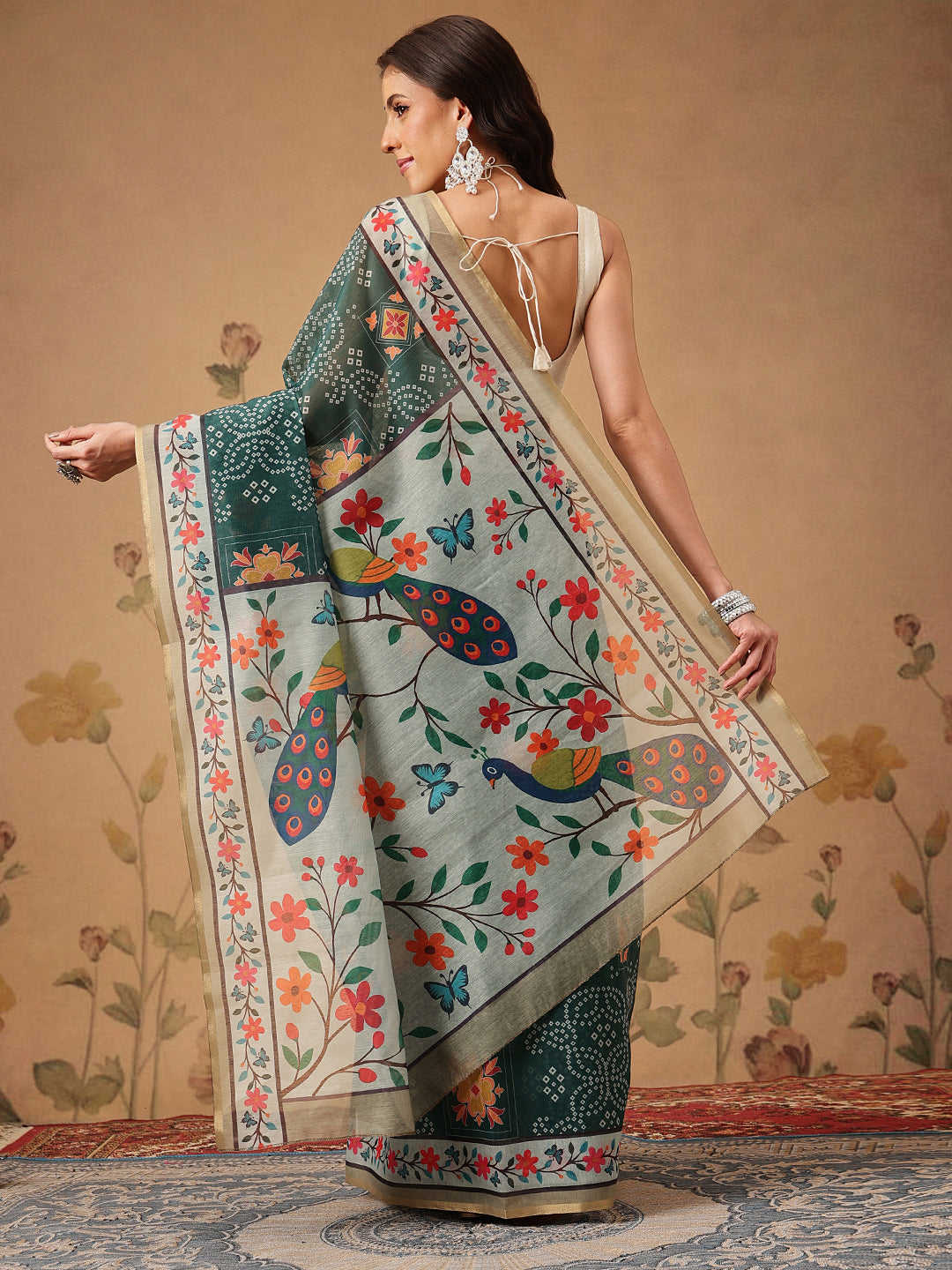 Saree Details - Saree Color: Green | Saree Material: Cotton Blend | Saree Length: 5.5 meters | Saree Work Type: Digital Print | Saree Type: Bndhani