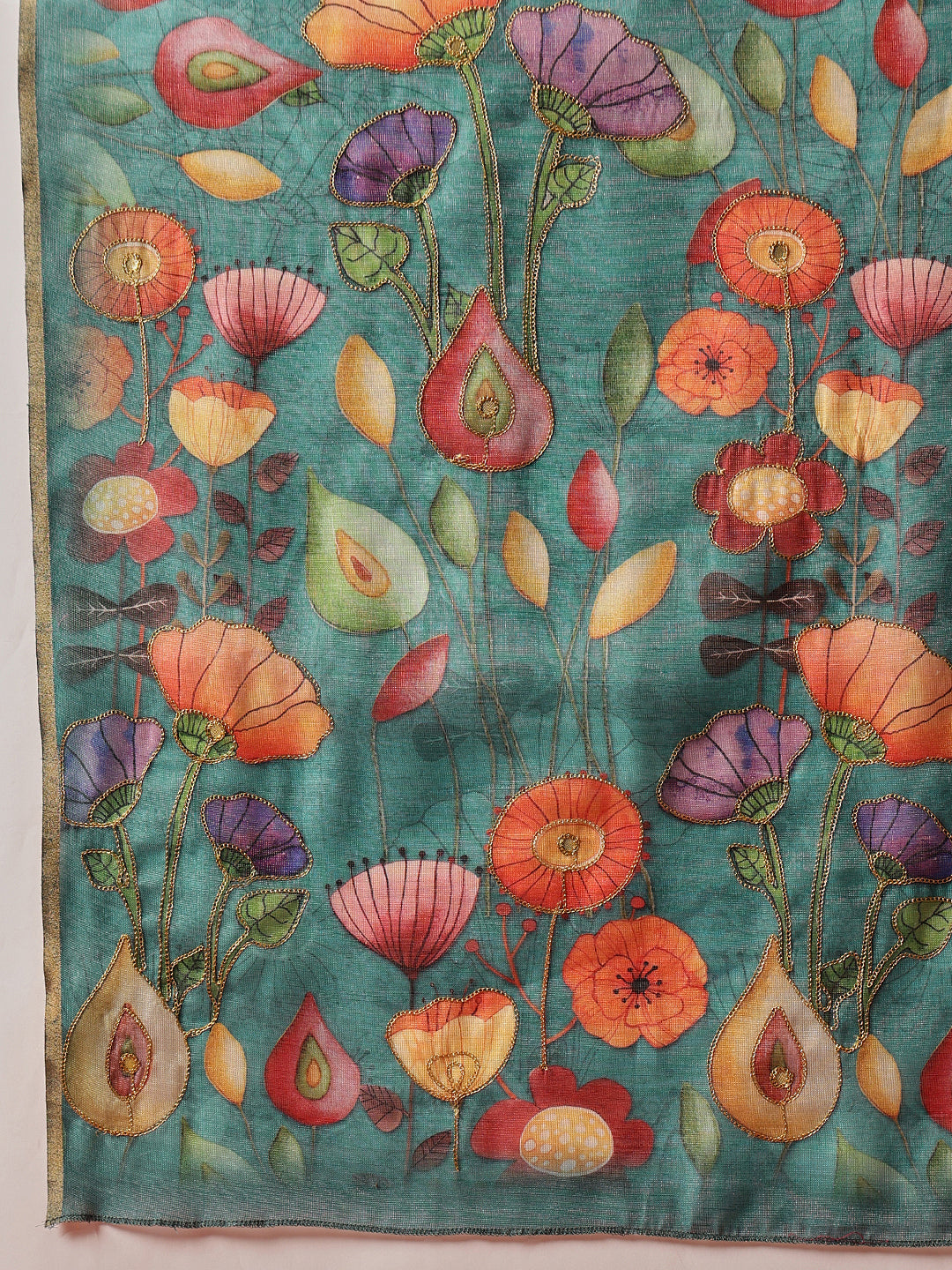 Saree Details - Saree Color: Teal | Saree Material: Cotton Silk | Saree Length: 5.5 meters | Saree Work Type: Digital Print | Saree Type: Floral