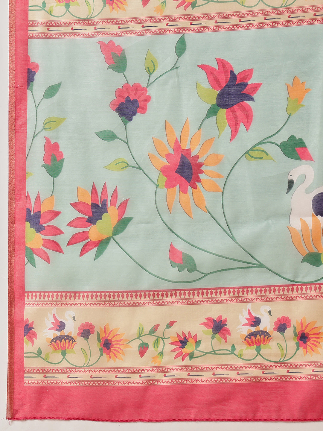 Saree Details - Saree Color: Teal | Saree Material: Chanderi Cotton | Saree Length: 5.5 meters | Saree Work Type: Digital Print | Saree Type: Floral
