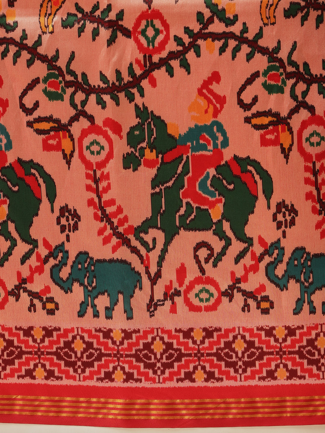 Border & Pallu details- Border Color: Gold | Border Work Type: Zari Patti || Pallu Color: Multicolor |Pallu Work Type: Patola