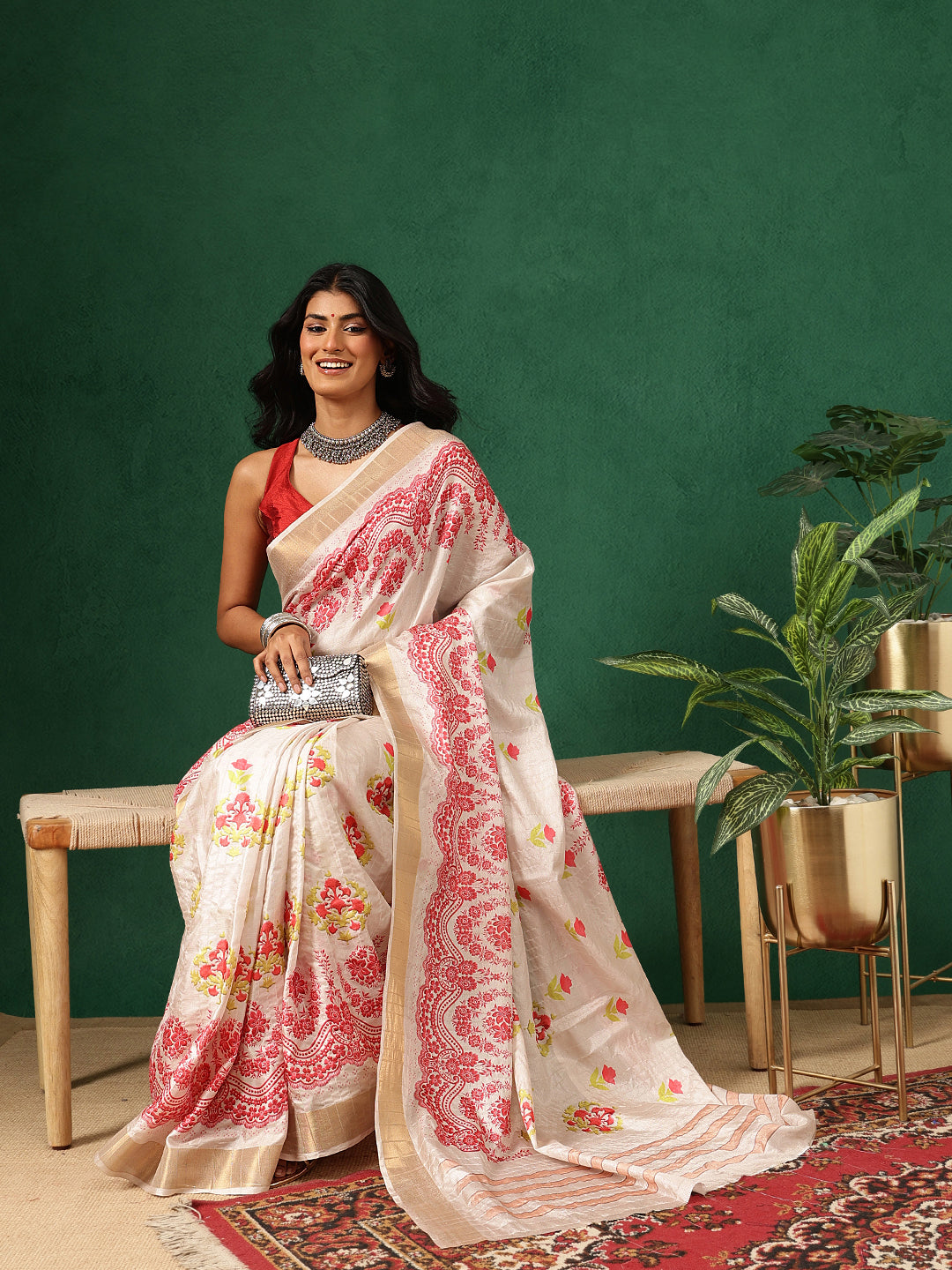 Saree Details - Saree Colour: Beige | Saree Material: Kotha Silk | Saree Length: 5.5 meters | Saree Work Type: Printed | Saree Type: Banarasi